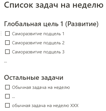 В конце каждой недели необходимо подводить подитог и ставить галочку сделано ли все что бы достичь глобальной цели или нет.